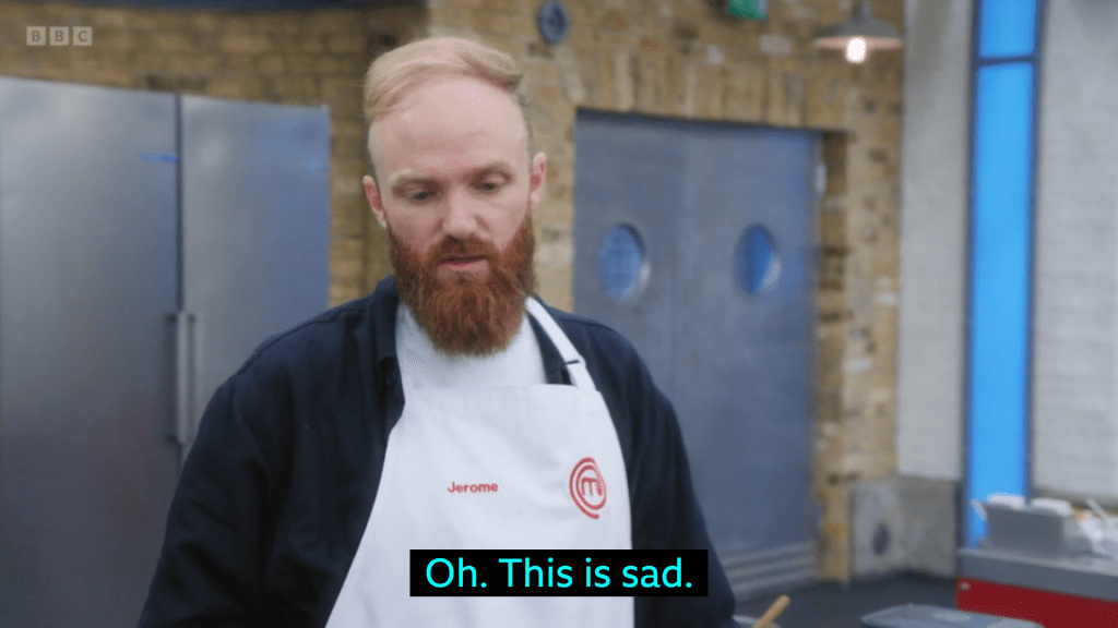 And lastly we come to Jerome’s Last Hurrah which may be the most perfectly executed MasterChef Disaster we’ve ever seen. Even the Russian judge would have to score him at least a 7.5 for this double salchow of a palaver. He was probably being the bravest of all the contestants and seeking retribution for the millenials that have long sought revenge on Jamie Oliver for what he did to the highly processed nuggets of miscellaneous meat that triggered more serotonin in our tiny brains than was ever explainable