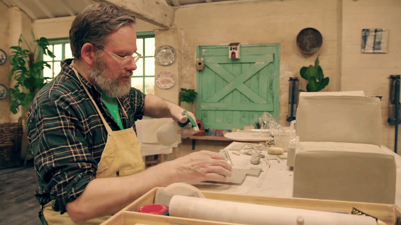 the problem being that by this point his clay had hardened too much to actually put the detail in so he spent the remainder of the challenge having to wet his clay with a spritz bottle like it was a misbehaving cat