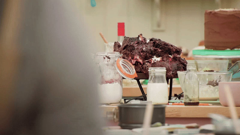 For their Showstopper, the bakers were having to create a Landscape Cake. The brief for which probably should’ve specified that the bakers ought to do some sort of 3D carved element because we did end up with a fair few tiered cakes with a design painted onto the side. The most egregious of which was definitely Jasmine’s that was meant to evoke the Scottish Highlands but really was just a gnome short of being a fairytale woodland cake for a 5 year old’s birthday