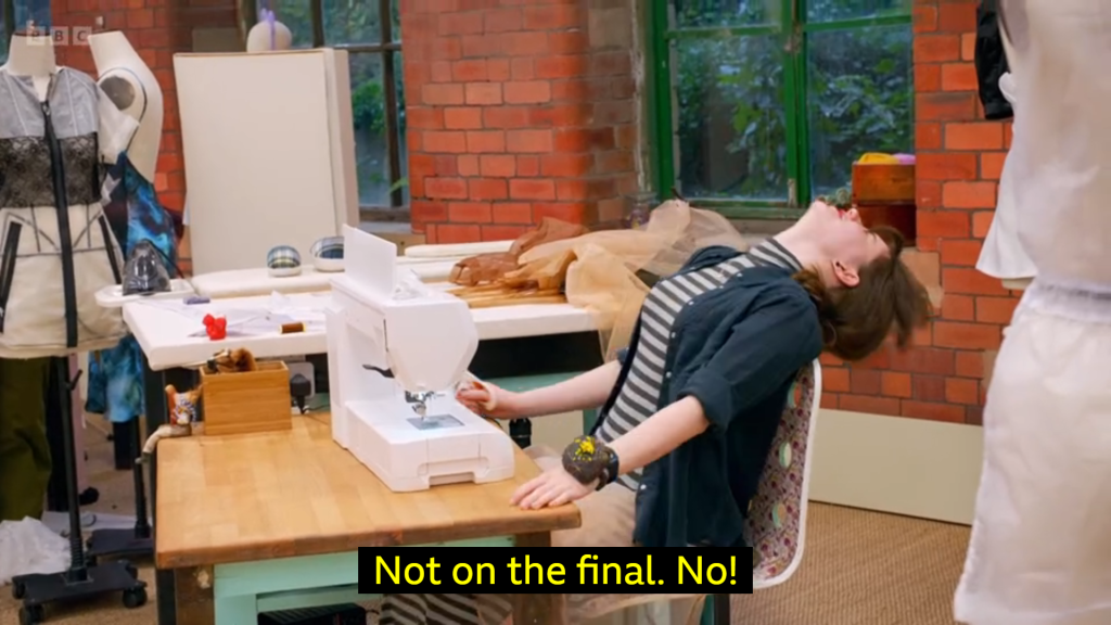 but the sewing was very much second in Yasmin’s priorities, her primary objective in this final being that everyone has to know how great her wife is