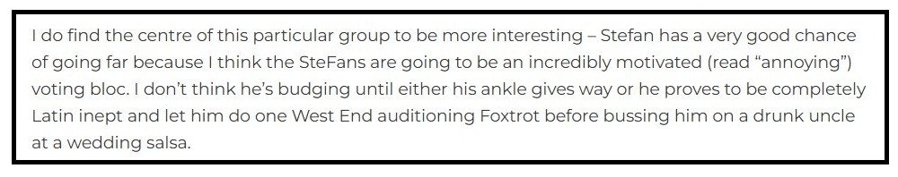 Instead Stefan’s Charleston was Jenny Thomas at her worst. But after 16 years of churning out 10 Charlestons a series like she’s mass producing swivelling sausage meat, I can’t really blame her for running on the sort of fumes that result in her thinking crawling along like a pair of tandem wheelbarrows is what-we-shall-generously-call-choreography