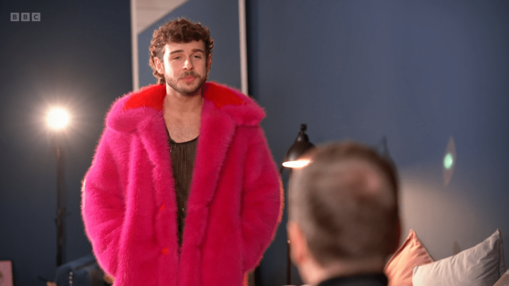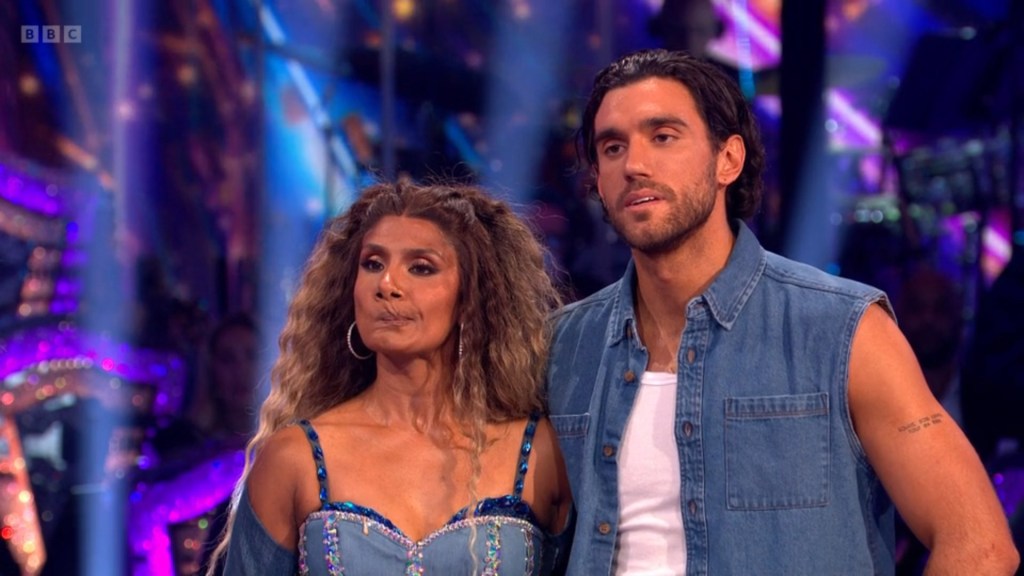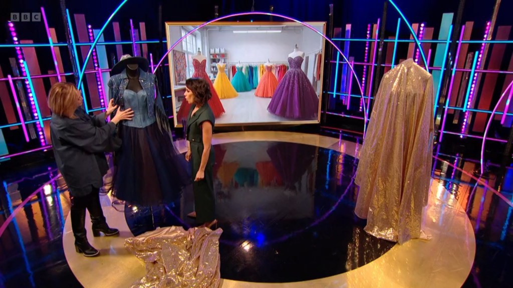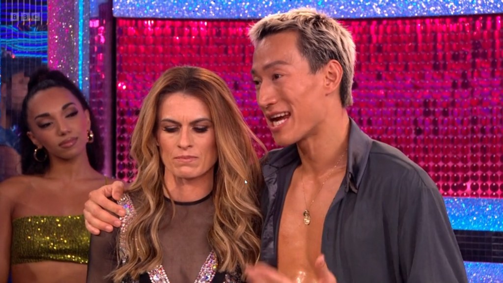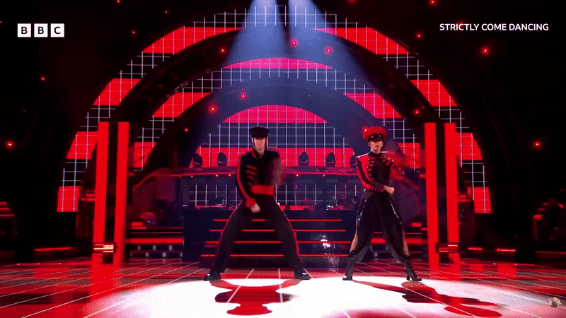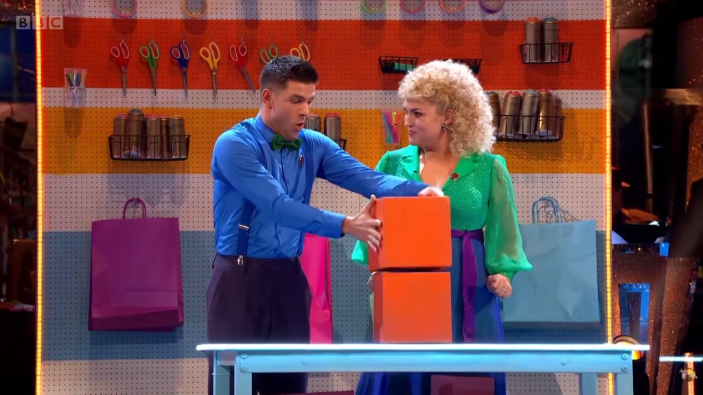 but I think Vicky would’ve had more success with the red and blue glitter, because the Strictly iteration of the heart-print dungarees is a bit like Tweedledee and Tweedle He/They run a pizzeria together