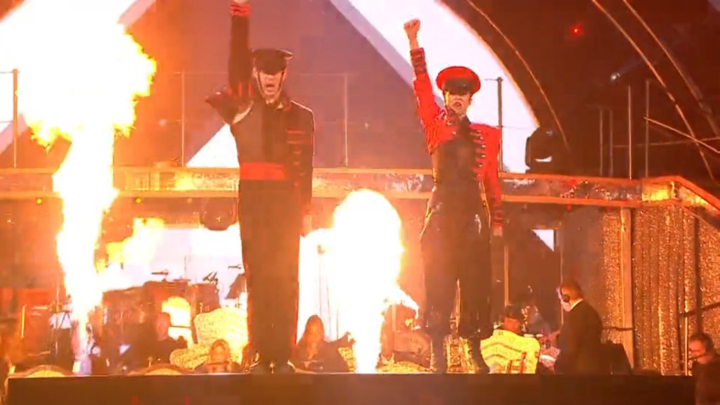 at some point someone really should’ve stepped back and realised it looked like a Leni Riefenstahl production and told Kai to either tone down the marching and saluting or… maybe less lighting effects. I know they’re referencing the music video, but importantly, Cheryl doesn’t do the marching while wearing the military digs. My personal favourite far too literal interpretation of the music video however was this move that looks like Vicky and Kai are a pair of predatory hole punches stalking their prey