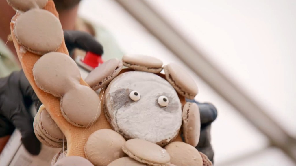 and then the macarons, the only baked component of this challenge are just… distinctly average and an afterthought to the monolithic suspended buttplug they’re haphazardly glued to