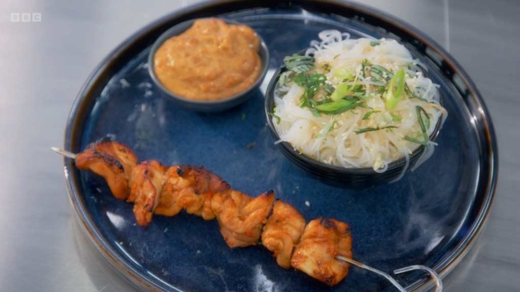 Ginger did end up with the most successful dish of the round, as much because Chicken Satay with a Rice Noodle Salad is a real plate of food as because it was well cooked