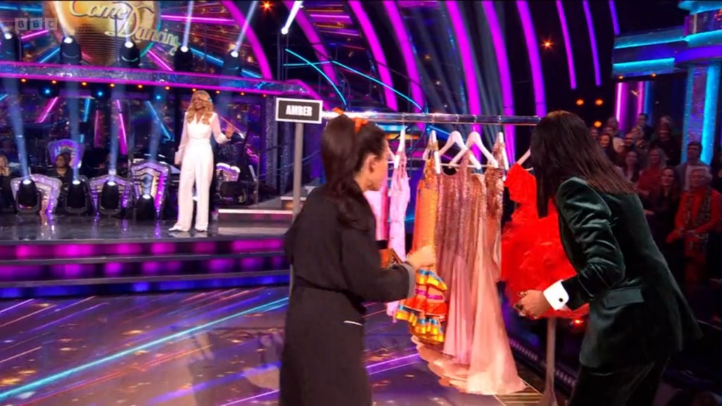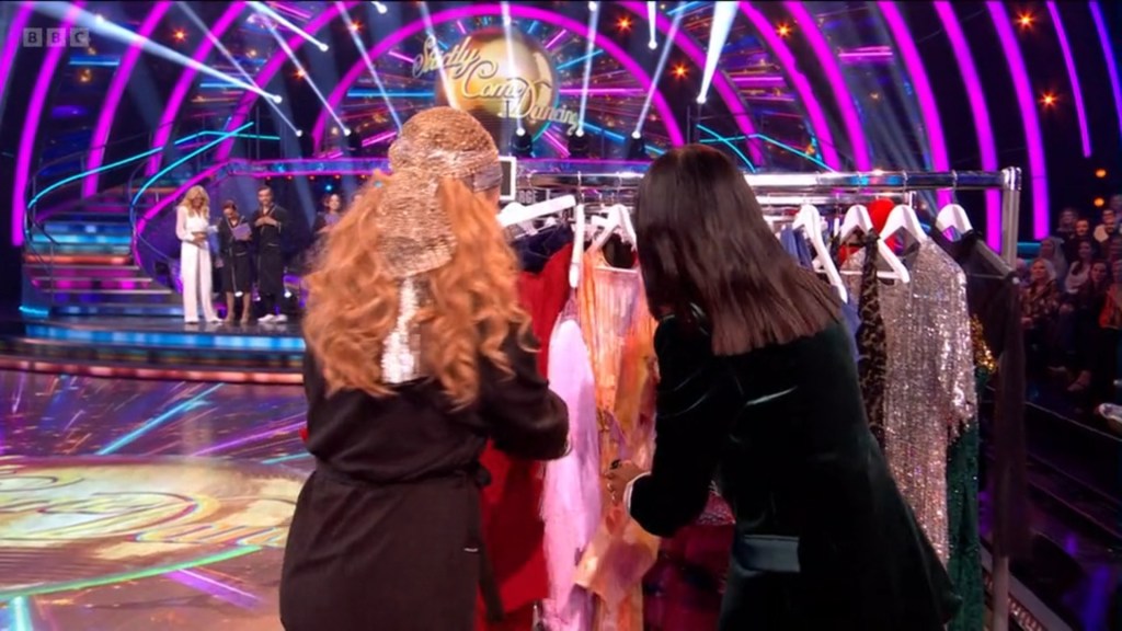 So once the couples had had their outfits thrown at them by Chaotic Evil Charity Shop Sue, they headed backstage to get changed, which is a fascinating look into the Glittery Sausage Factory – and if you’re wondering how many people it takes to wrangle Nikita into a pair of novelty trousers, it’s 3!