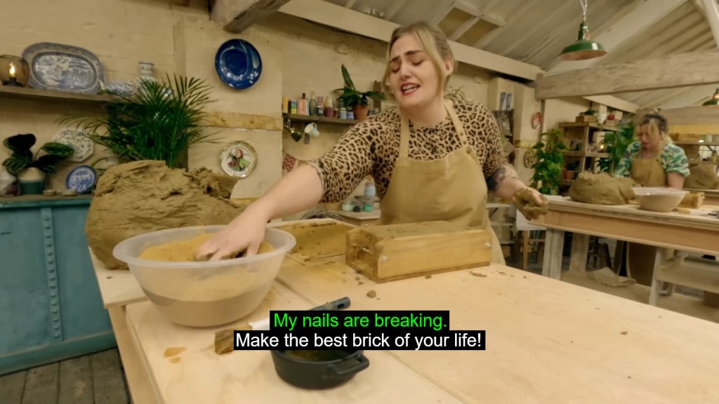 This week’s second challenge was more of a literal Throwdown as the potters found themselves having to make 10 bricks and lay them into a herringbone pattern. Kaz may have come last in the Bricklaying Championships because as it turns out finishing off your bricks like you’re trying to make your slowly melting cake stay together on Bake Off is an illegal clay manoeuvre