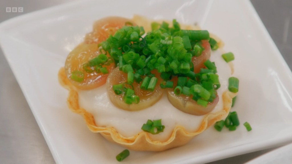and this would not be the only errant tartlet in this round as Gemma’s Taramasalata and Pickled Grape Tartlet is a thing of truly malevolent evil