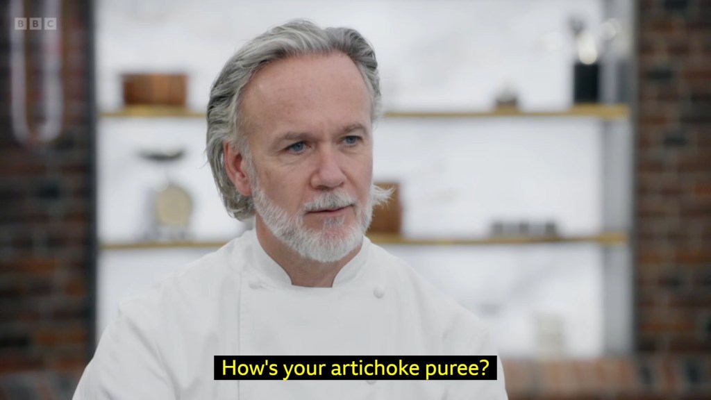 and had to use the last few minutes of the challenge to pickle artichoke shavings instead and so his plate ended up looking like a violent sneeze with a valiant effort to hide the fact he’d just served up Razor Clams, entrails and all