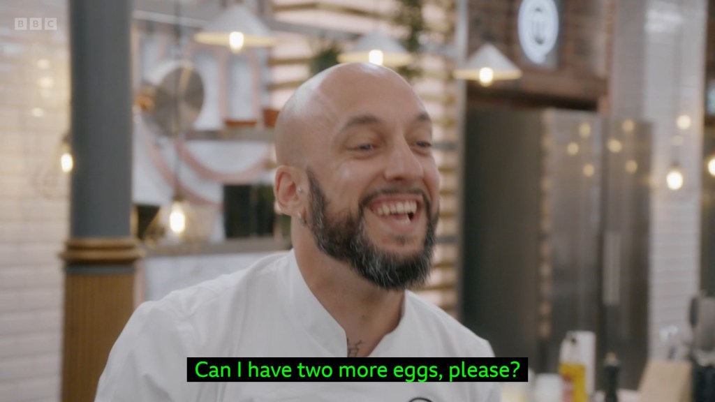 and he didn’t just do it once, he had to ask them to break the glass of the emergency egg case so he could continue his futile efforts to poach an egg yolk