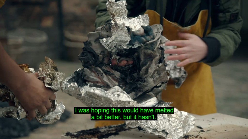 Fynn also had some minor issues with the combustibles, his kiln hadn’t reached a hot enough temperature to fully melt the tin foil he’d wrapped it in