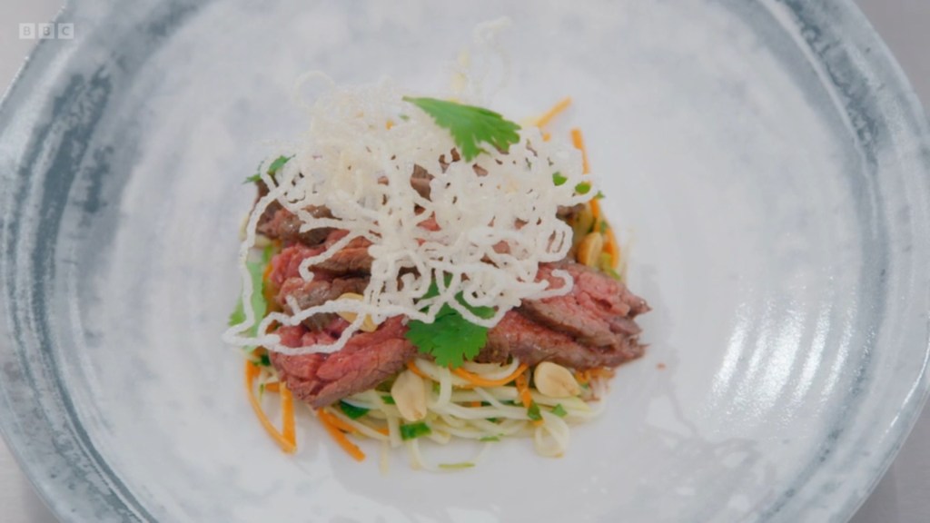 For the first signature of the episode, Nikita was tasking the chefs with cooking a Bavette Steak and serving it with a dressed Papaya Noodle Salad with a garnish of Crispy Noodles