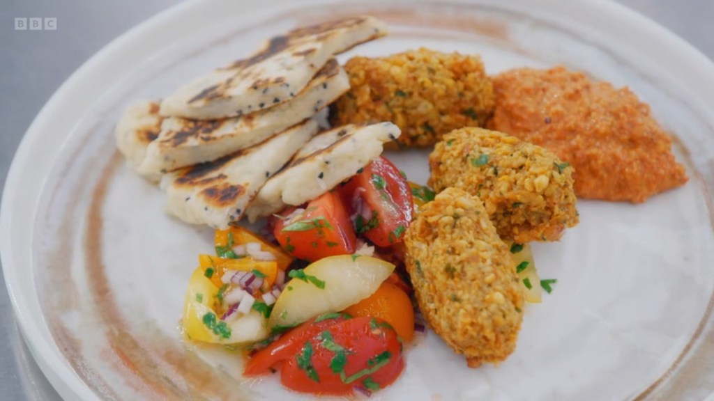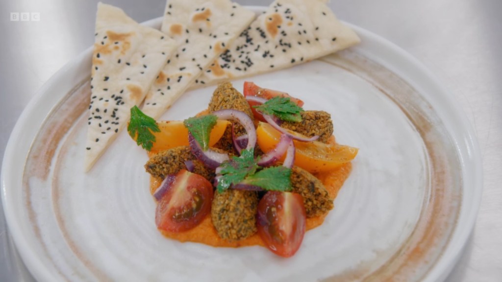 Nikita’s final Skills Test was a plate of Falafels and Flatbread served with a tomato salad and Muhammara – a Syrian dip made from peppers and walnuts