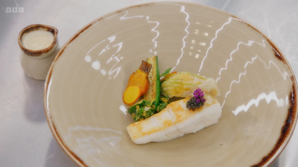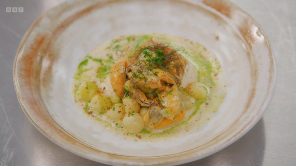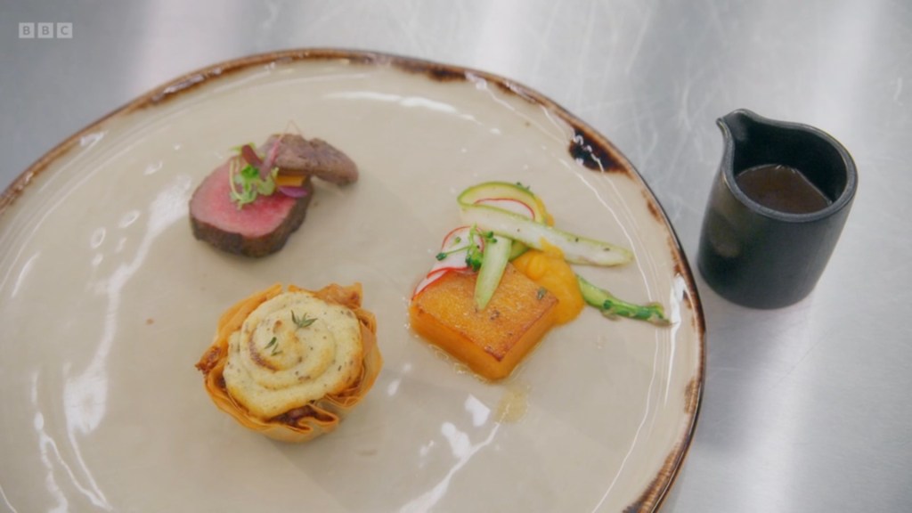 the dish is VERY pretty but it does get to become a bit of a cocophany around the time she proclaimed the scallop mousse in the tempura courgette flower was being joined by pancetta and that she’d used soy sauce in the leek sauce AND was adding a pistachio chimichurri. It was all very good but it’s a dish you can tell was made by a young chef. However, I do much prefer her maximalism to whatever Charlie was doing with his Venison and Kidney Pie
