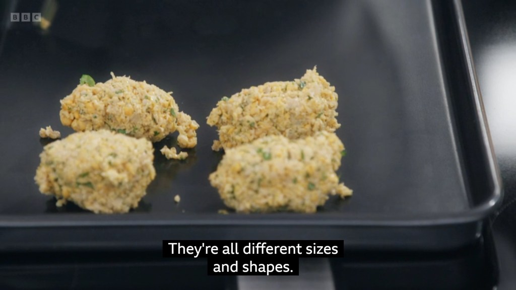 Charlie’s falafels were slightly neater, however he’d panicked over how course his mixture was and began adding more moisture to it completely unnecessarily