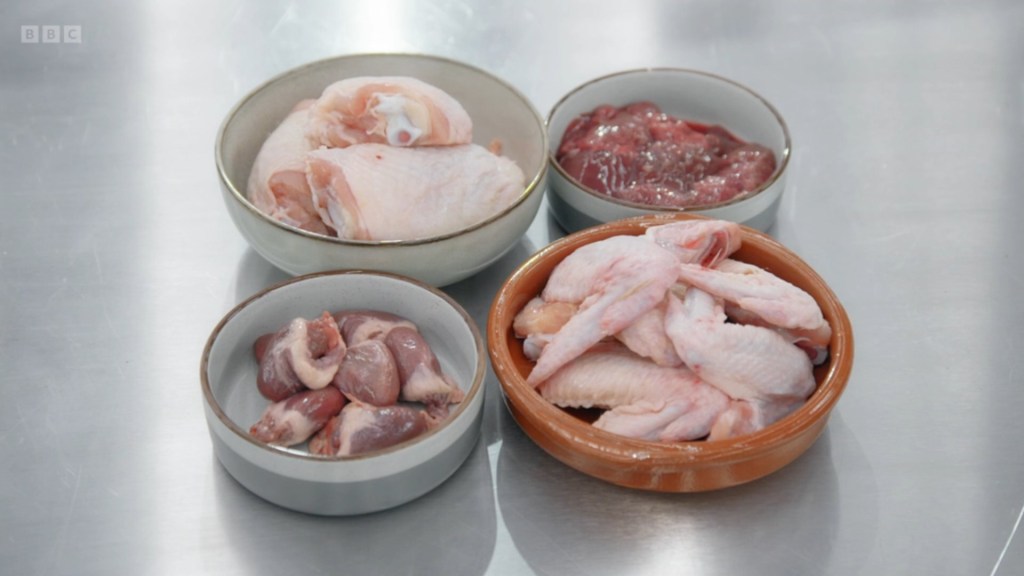 After last week’s Rice Pudding debacle in which nobody knew what they were doing, least of all Monica and Marcus, we are on track with a more normal Invention Test utilising various secondary chicken bits
