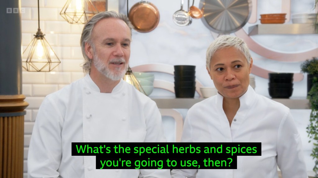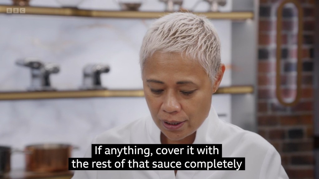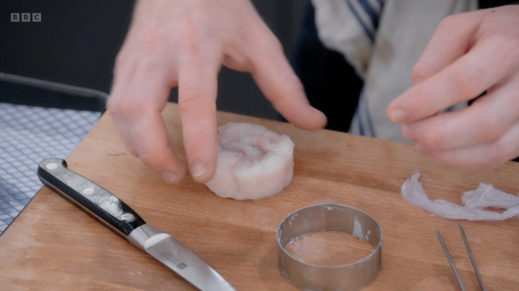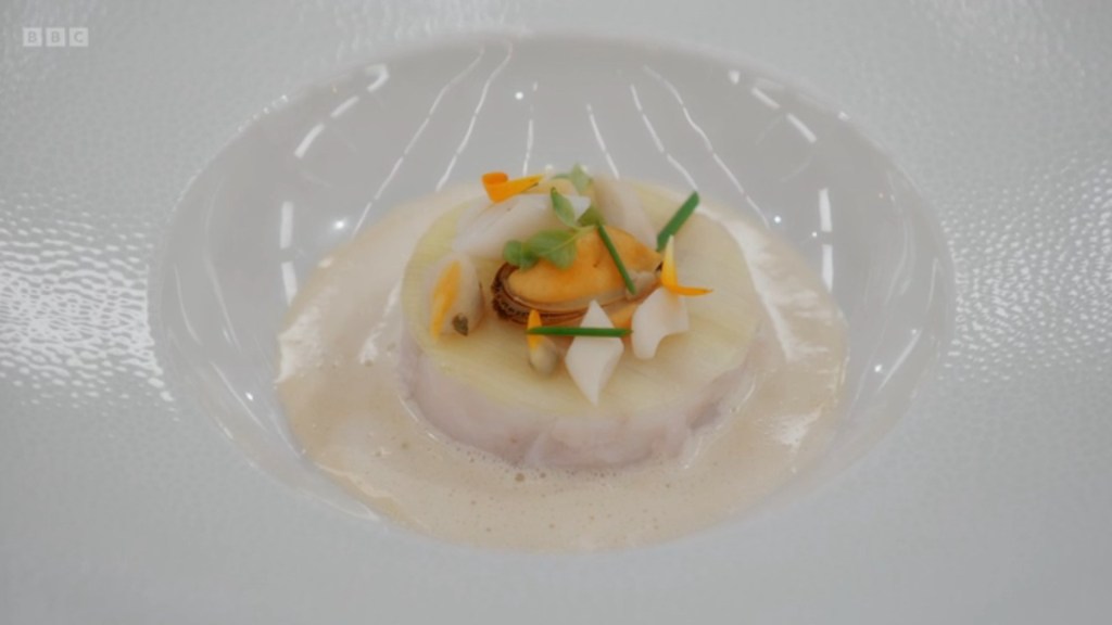 and she was joined by Jay Rayner and Leyla Kazim for this surprisingly halibutless quarterfinal! Instead the only fish dish was Patrick Uzumaki’ing a gurnard into a disconcertingly perfect disc