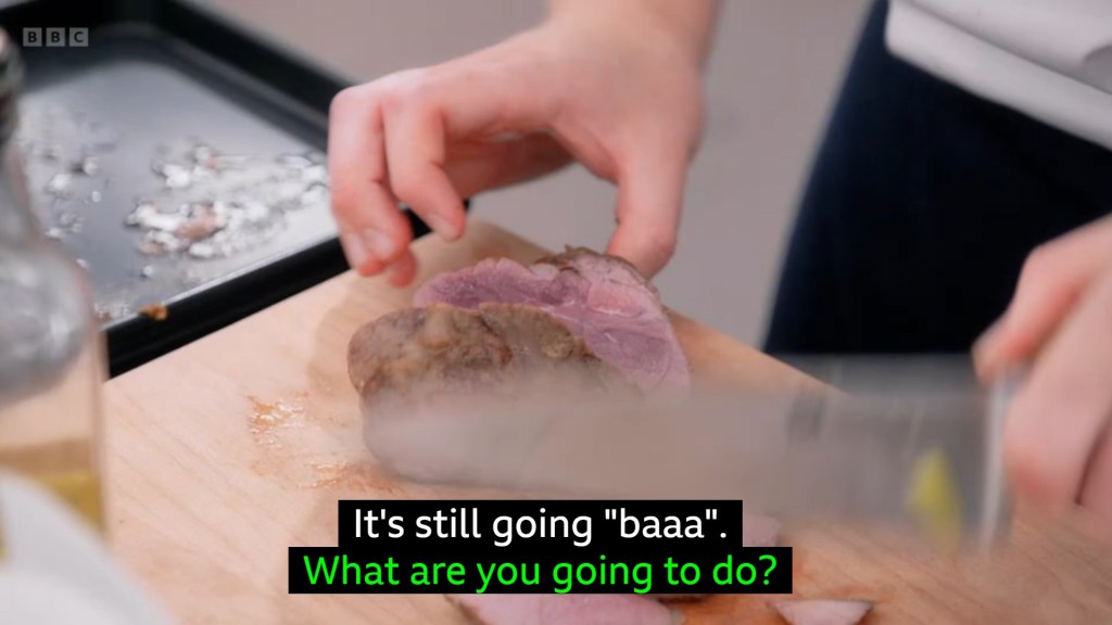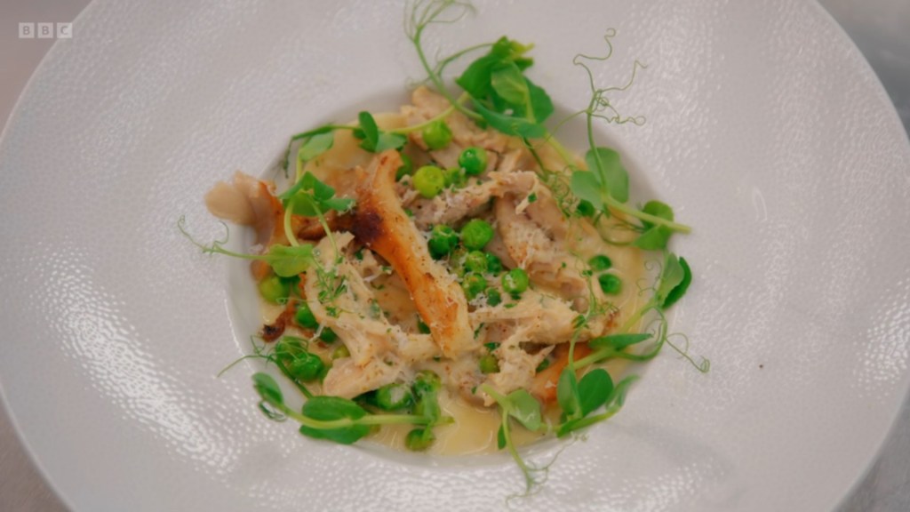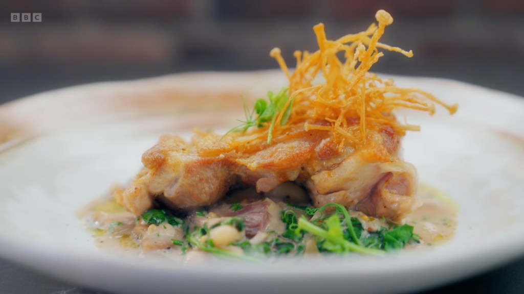 again with Polly, there’s flashes of brilliance here and there and if she’d stopped to think of a way to make the chicken thigh reach the same level of interest as the liver and onion ragu or the deep-fried enoki mushroom (a God Tier food btw) she’d have been on to a real winner here. Although she might have still had the best dish purely on account of it not having raw hearts, the aura of a French woman on the edge of a breakdown or my irrational grudge against Patrick going against it.