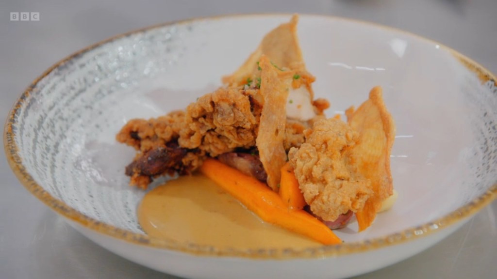 this plating… it’s like a platform crossing puzzle from The Crystal Maze’s deleted Classical French Zone. It does show some good technique with his rolling of the thigh and the making of his Blanquette Sauce but the Invention Test isn’t really for the classics, it’s for making Fancy Fried Chicken