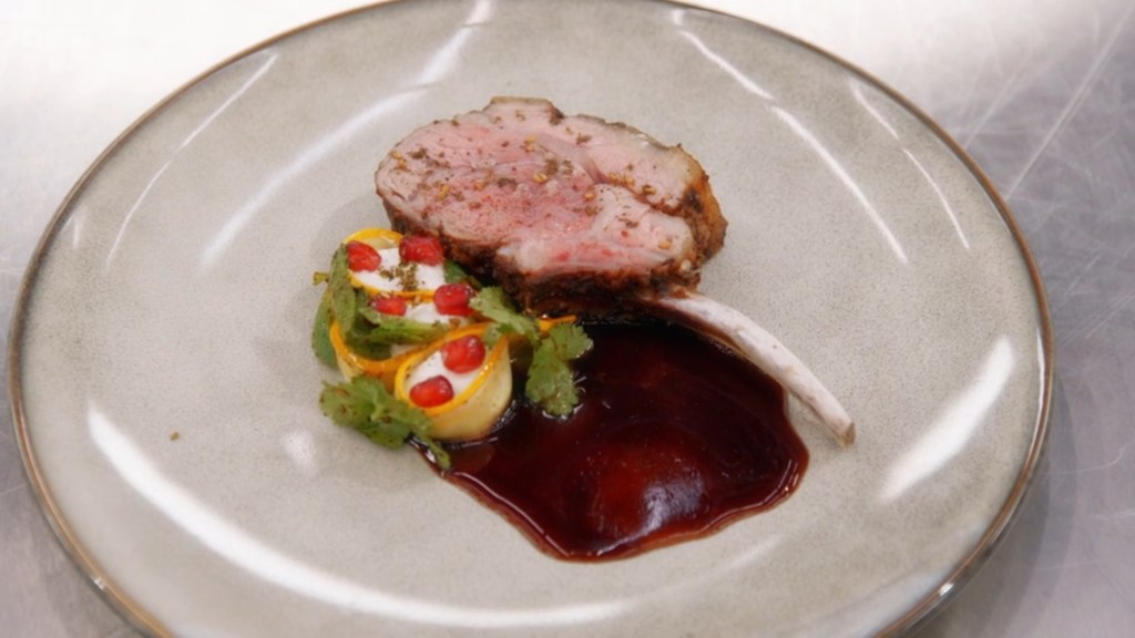 it sounds delicious but my only contention is that 5 sprigs of coriander does not constitute a herb salad, that’s still a garnish at best and not worth listing on the menu description. It was just nice to see Polly prove that she could make a dish that didn’t feel like it had a late-stage element added out of pure panic and insecurity. If anything, the lamb dish could maybe have used some sort of starchy element to bring it all together a little better.