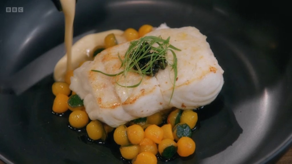 We did of course end up with a pair of dueling halibuts in the room as Anthony and Gareth went head-to-head over fish courses. Both of them ended up going down very well with the judges, but I do think that as boring as it is to see the umpteenth Fancy Fish & Chips trotted out like a bear in a Soviet Circus, Gareth’s take was the better dish
