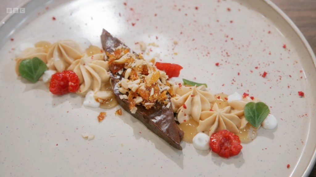 it’s an assortment of glacé cherries short of being the sort of malevolent evil party food Fanny Cradock puts out into the world. The judges however were more taken with its fussiness than I was, but thought the balance of the dish was way off. They loved the chocolate delice and the peanut mousse but the whisky gel wasn’t letting anyone drive home that night