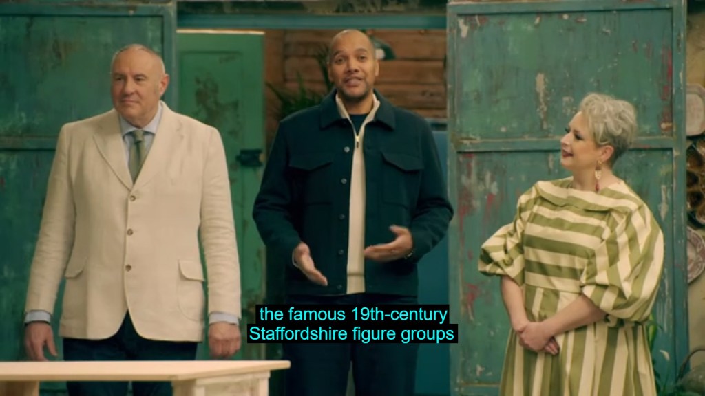 After the last few years in which the final main makes have been great big galumphing behemoths (Tulip towers, man-sized amphoras and those extremely ugly chandeliers, DEAR GOD THE CHANDELIERS) we’re back to collectable miniature nonsense as the finalists had to put together a Model Stage inspired by the Staffordshire figure groups