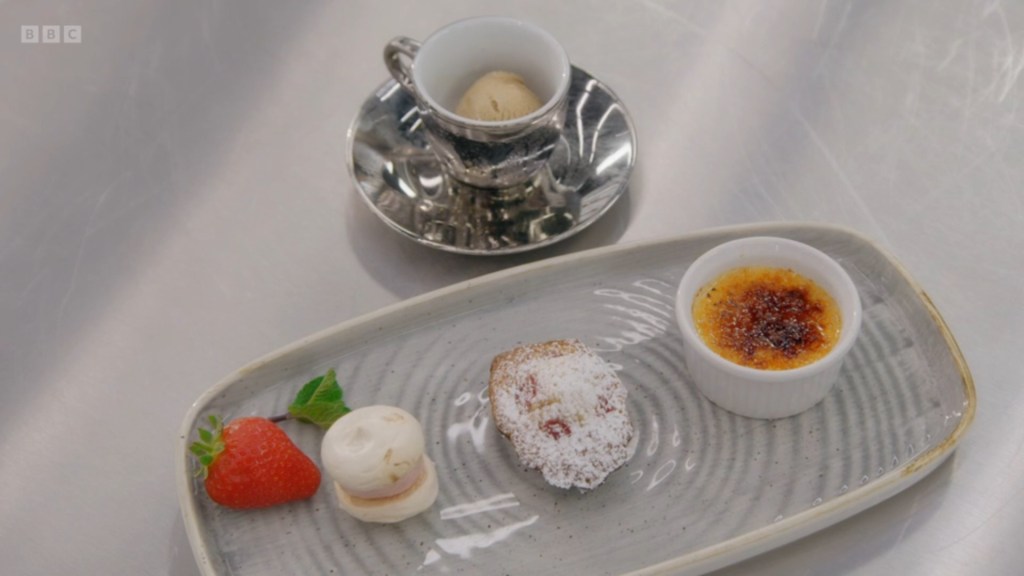 but there was nothing that really hung the ~assiette of granny~ together very well and she maybe could’ve just done the Creme Brulee and the Madeleines because as much as I love an Affogato, it didn’t add a huge amount of skill and the strawberry ice cream slammed betwixt a pair of meringues is… kind of a nothingness that I’m sure played to an audience better 100 odd years ago than it does now – they were still whipping out pineapples to impress the neighbours. Can you imagine if you confronted Georgia’s grandmother with Mario’s Cheesecake Ice Cream? It’d be crucifixes at dawn!