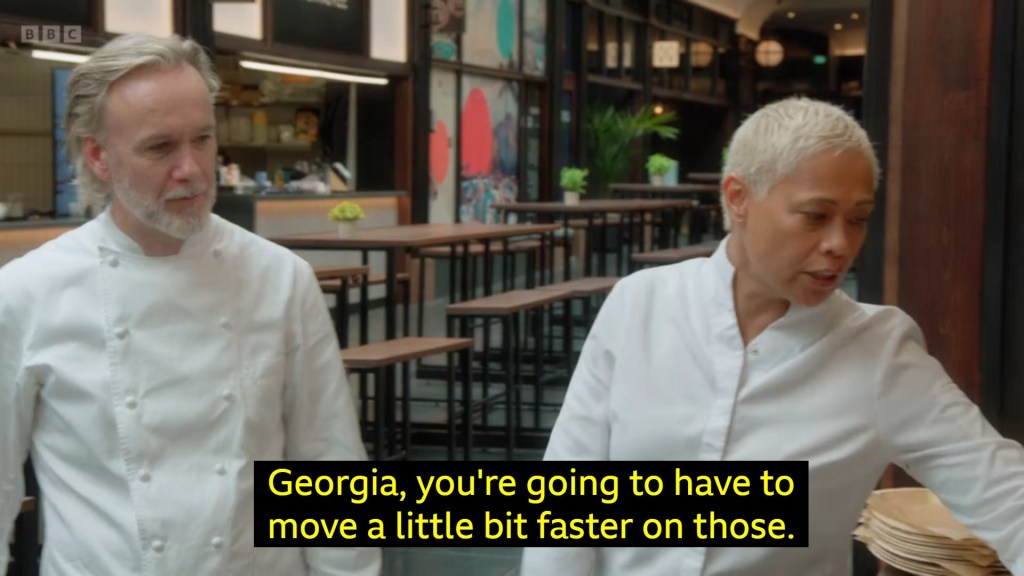 Ultimately Georgia and Mario made many of the same mistakes in this round that they did in the Pop-up Round – Georgia keeping just making picky bits for dinner (NO COMPLIMENTARY) and Mario’s never met an entire bag of sugar he didn’t want to funnel down your throat (kind of complimentary.)