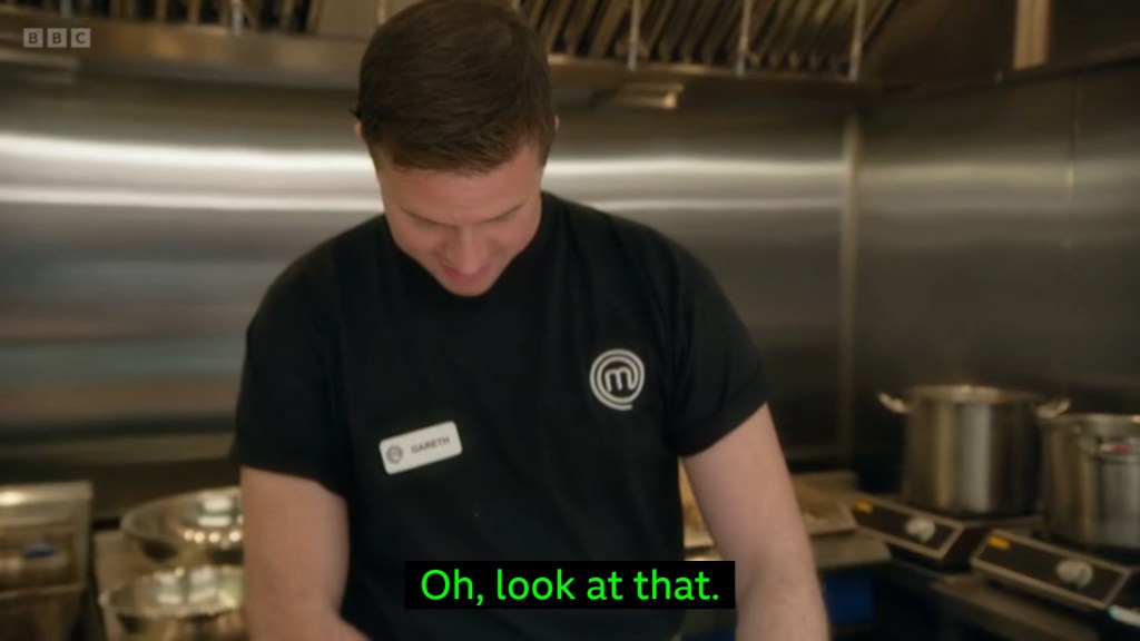 Something that’s really funny about this whole process is that they don’t tell the winner that they don’t have to cook in the next round *at* BoxHall – they drag them all the way back to the MasterChef kitchen and tell them THERE. Were they concerned that Rizwan had been ballot stuffing in favour of that really cool metaphorical coyote? Divas, you didn’t *have* to make Gareth miss his kid’s birthday…