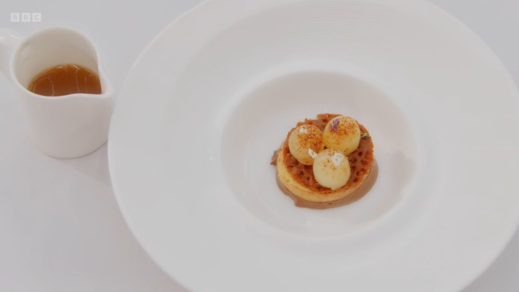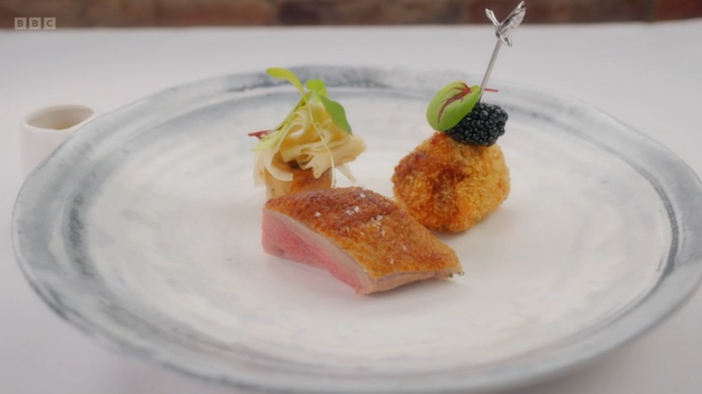 the vague theme of his menu was the Ye Olde MasterChef Favourite of putting a ✨spin✨ on a classic – the main course being pancakeless duck pancakes. His starter was probably the best iteration of this, having taken an English Breakfast and decided to serve it as a Raviolo filled with Black Pudding and an Egg Yolk with a Sausage Sandwich and a homemade brown sauce on the side (which he did credit Mark Donald, Professional Loch-stander, as the inspiration of)