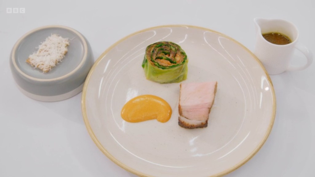 and it’s very much “I want to go to there” and is still very much Professional cookery but he can’t be The Big Meat Manâ„¢ in the final so we end up with a Pörk Choppe and Hispi Cabbage and Crayfish Roll