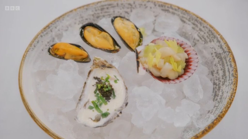 Mark’s menu was what he claimed would be his final meal with his starter being a take on Fruits de Mer – and if you are going to be sentenced to death, you might as well make it everyone in the room’s problem with a platter of Oysters, Mussels and Scallops