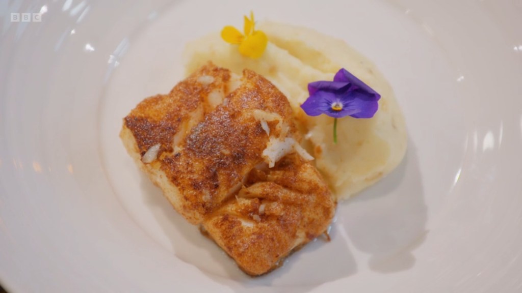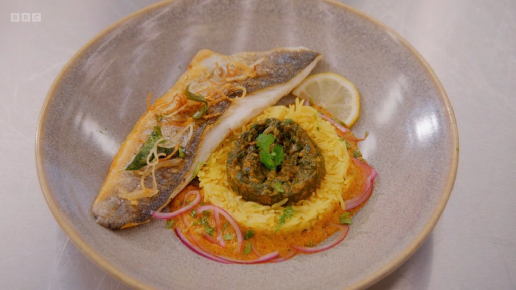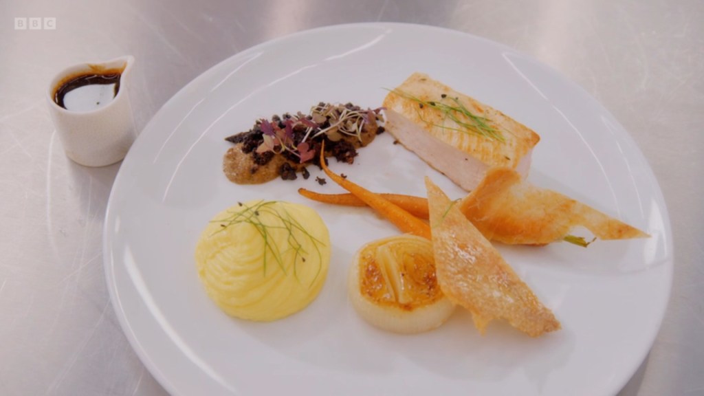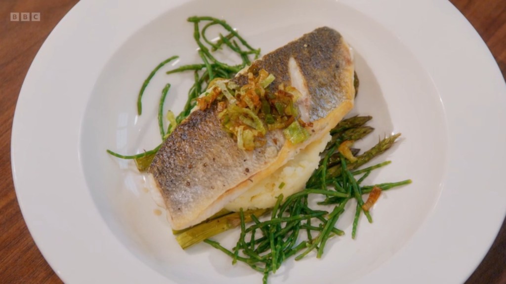 there were some slight errors like the fish skin being wobbly (Brendan set a very high standard for dermal cookery this week) and her vegetables with the sea bass being a bit greasy.