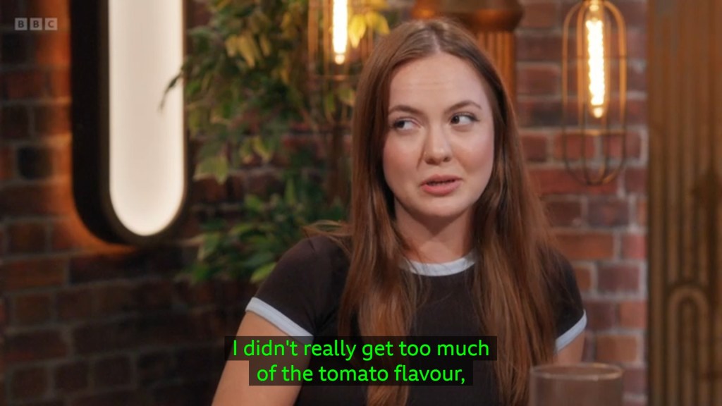 Sophie is Vegan and I personally think that they should MAYBE have told the contestants that this would be the case so that they could potentially plan for the event – either making a vegan dish or at least incorporating a component that Sophie could actually eat and judge instead of making her nibble at a roti, a slick of sauce and a rogue blueberry as her blood sugar levels plummeted with her posture in the chair