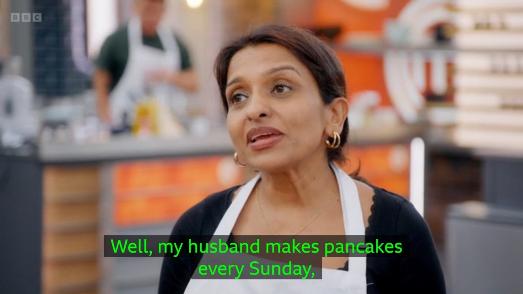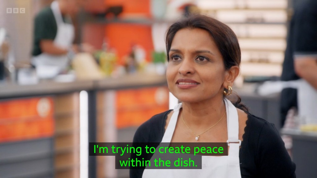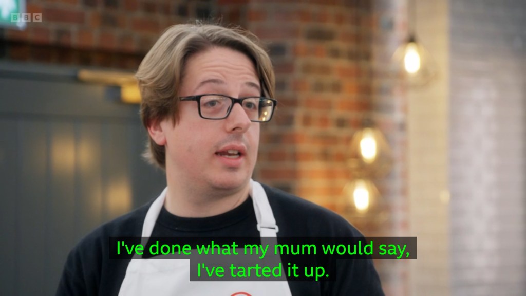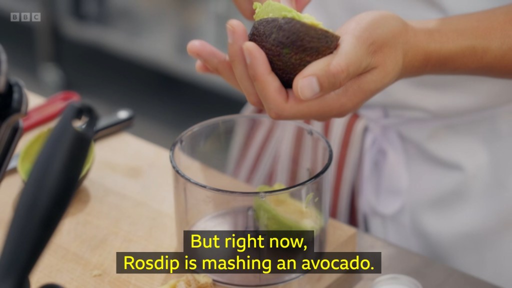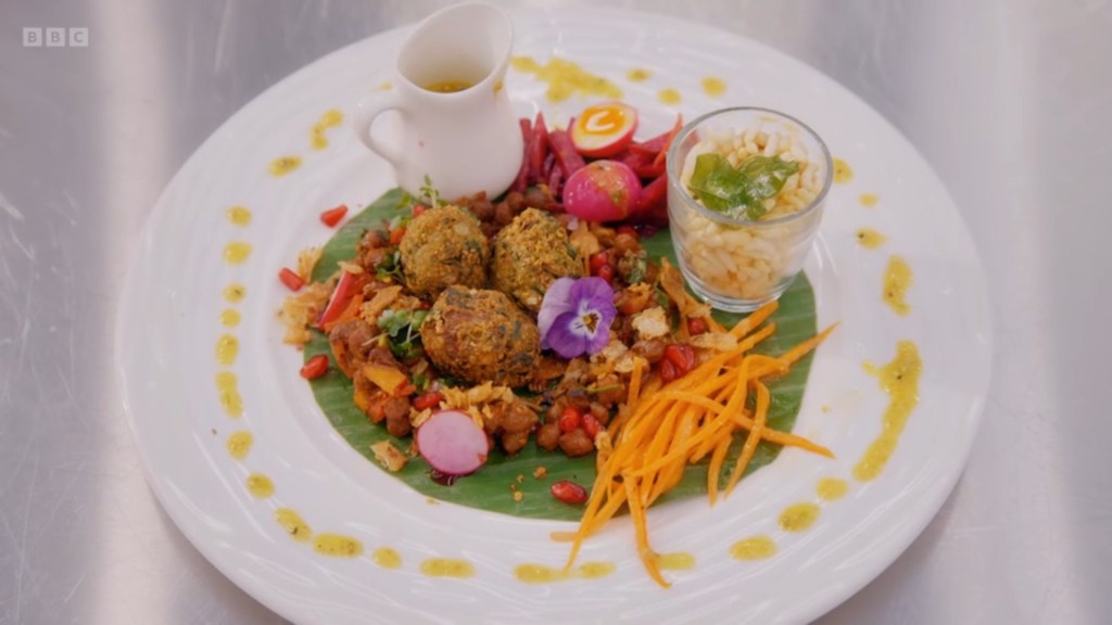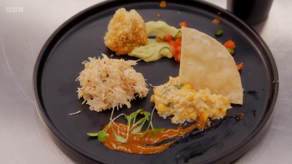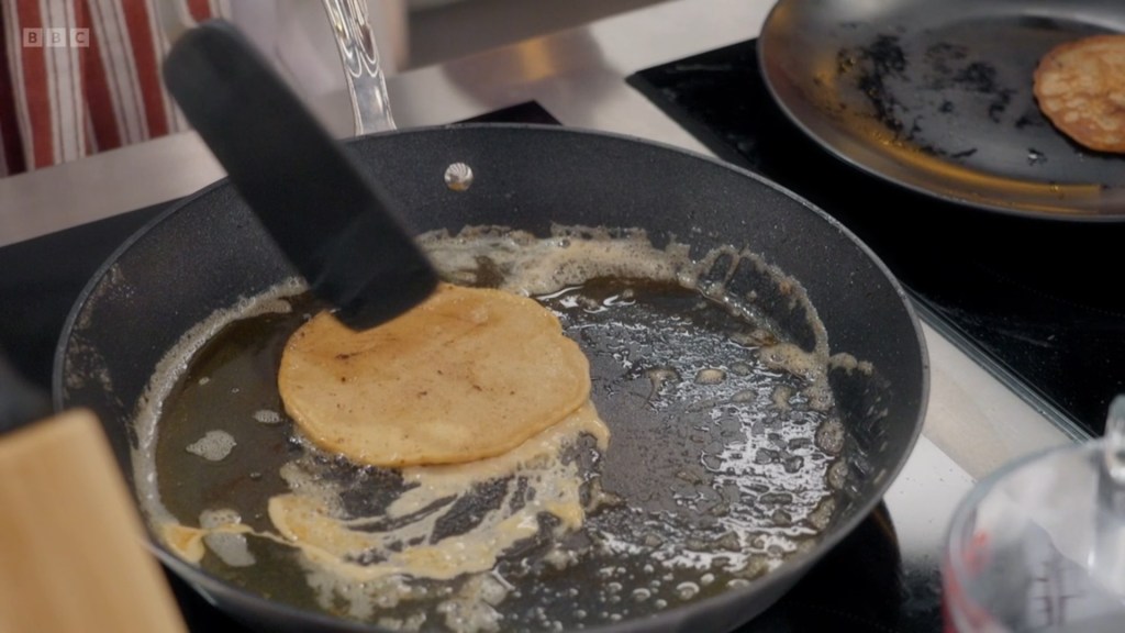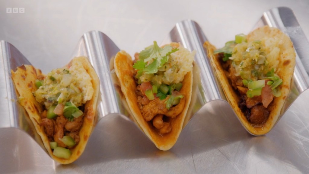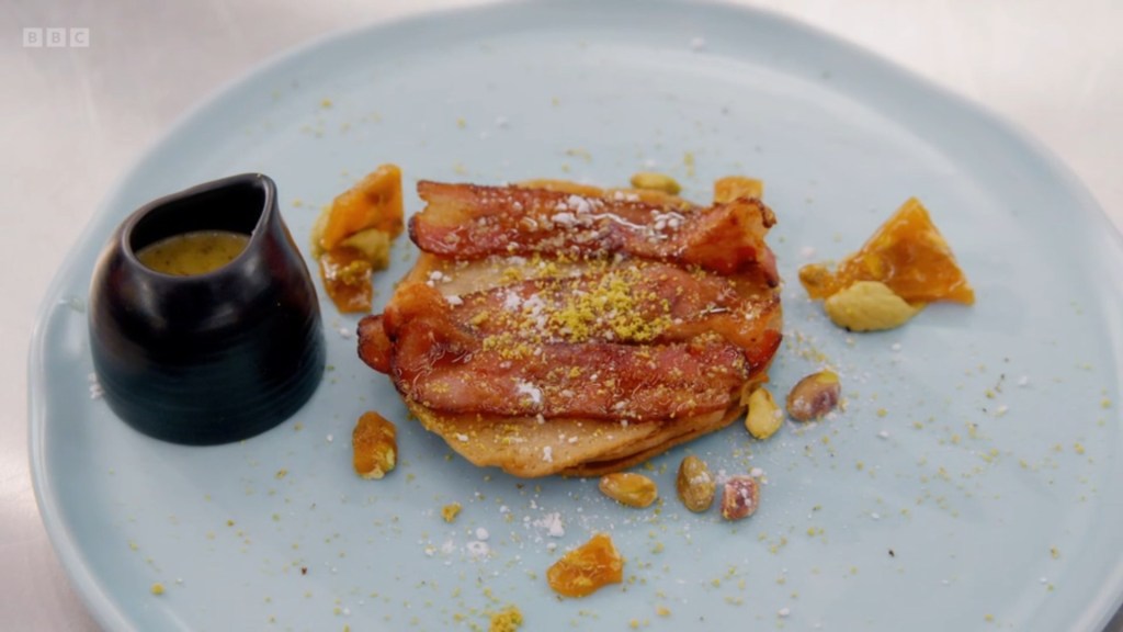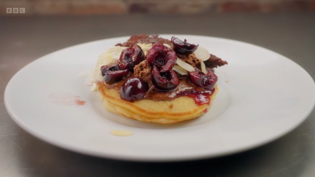 I was surprised that the majority of the contestants had gone for savoury pancakes – I don’t actually know what to classify Rosdip’s combination of Pistachio Custard, Bacon and Avocado as? It’s sort of the Nonbinary Icon of menu options – it is everything, it is nothing, it probably goes by the name Sock. The remaining contestants were giving us a whirlwind tour of global cuisine, Jhané being the most “experimental” by making the lateral move from pancake to tortilla and just doing tacos