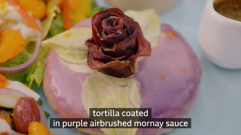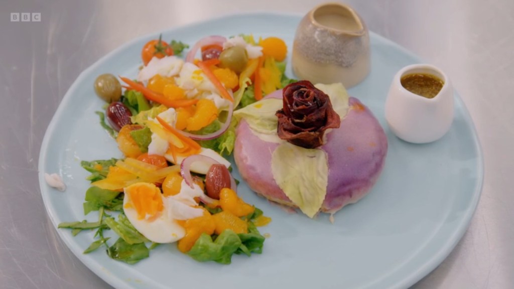 I actually think these might be… good? A pancake filled with ragu topped with bechamel? Lovely! The judges were a bit picky about the presentation but I don’t have that big an issue with this? Granted, I do also have the benefit of hindsight to be able to say “At least it’s not purple.”