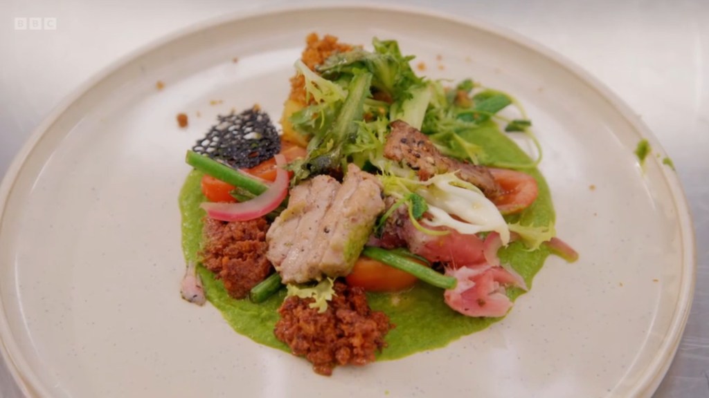 the judges loved the presentation and I can only imagine Michael looked down at his plate and felt the first twinge of realisation that he’d painted a tortilla purple. That was where Rosdip’s compliments ended because they all felt that his mustard and tamarind dressing was too mustardy and the vegetables in his salad just kind of boring. It was always going to be a bit of a coin toss between Rosdip and Jim as to who would be eliminated alongside Michael’s GCSE art exhibits and Maddie throwing six horse divorces at a plate because she forgot what a salad is