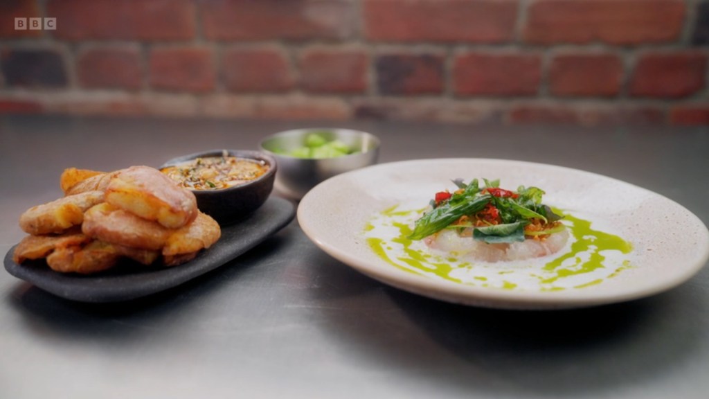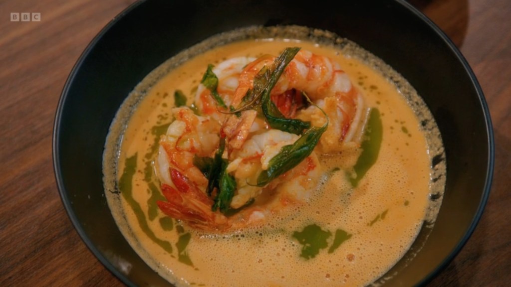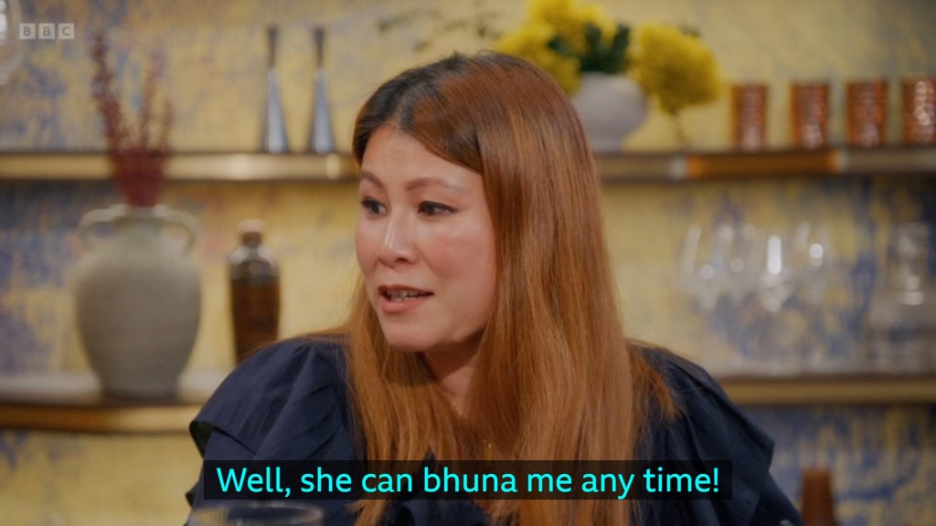and the prawns were beautifully cooked but her sauce needed maybe a little bit more attention to seasoning. Anisha, knocked the whole thing out the park, so much so that Ping is in the hotel room bhunussie at the ready