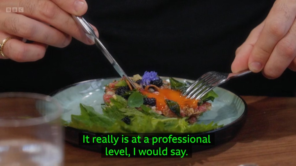 babe? That’s barely tasting menu portion!? Although it did turn out that one single piece of pasta may have been a mercy because the pasta was very obviously still incredibly raw – you could see Grace having to brace herself for it as he plated them up